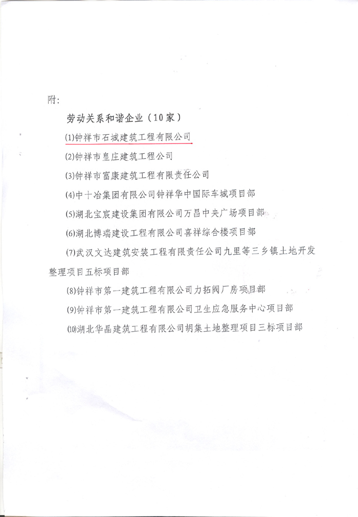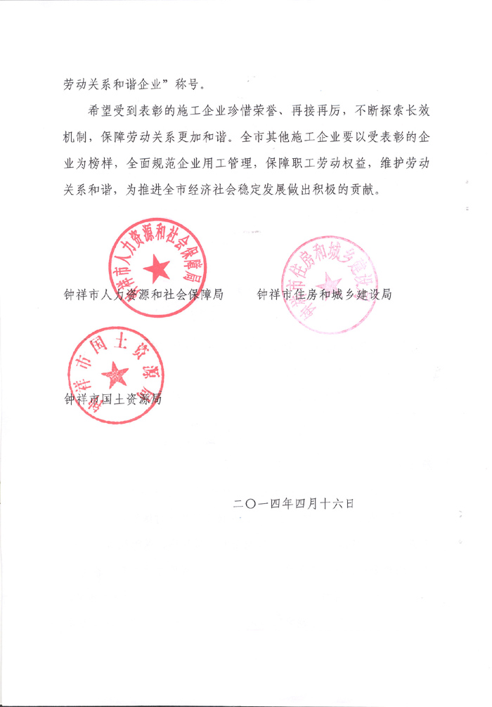 2014年4月榮獲“鐘祥市建筑領(lǐng)域勞動關(guān)系和諧企業(yè)”稱號